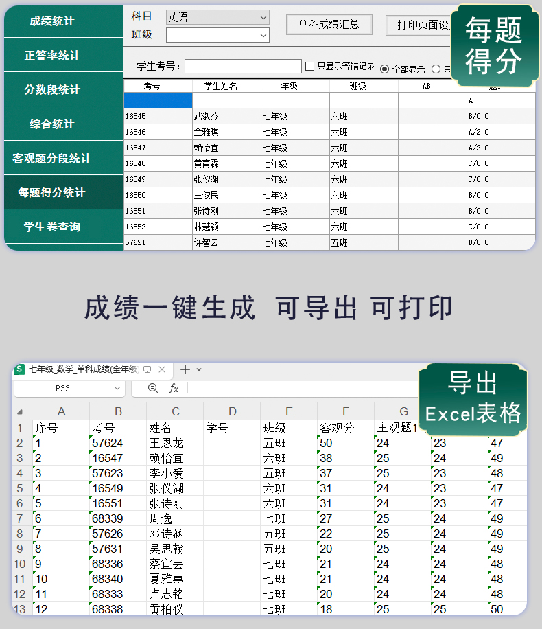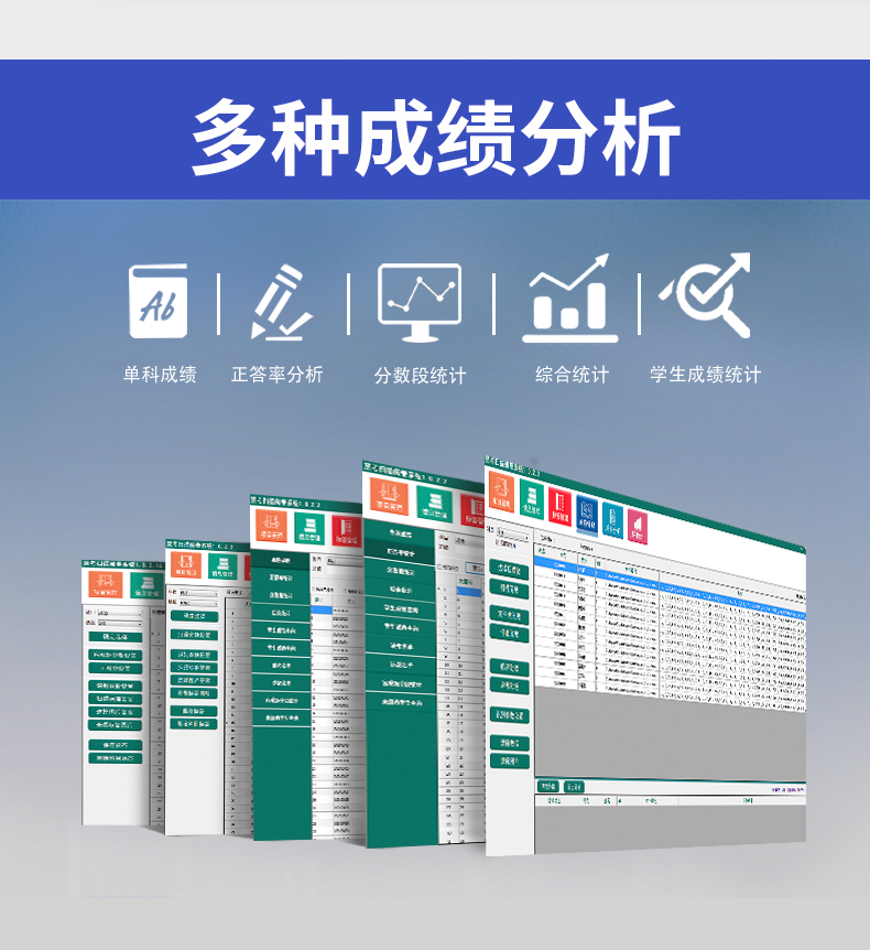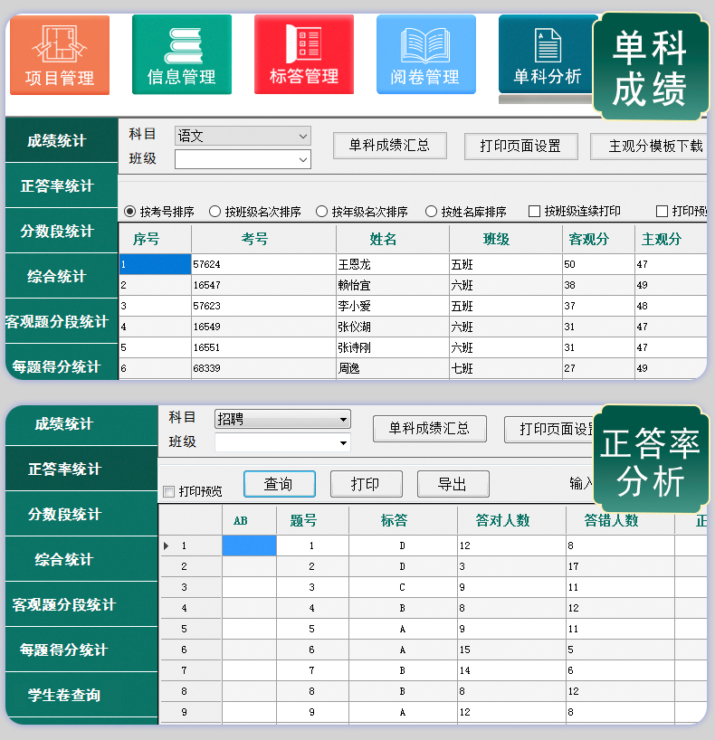 30、具有正答率統(tǒng)計、分題段統(tǒng)計、分數(shù)段統(tǒng)計,每題得分、單科成績、多科統(tǒng)計、班級名次、年級名次,缺考違紀名單統(tǒng)計、歷次成績統(tǒng)計、成績分析等等